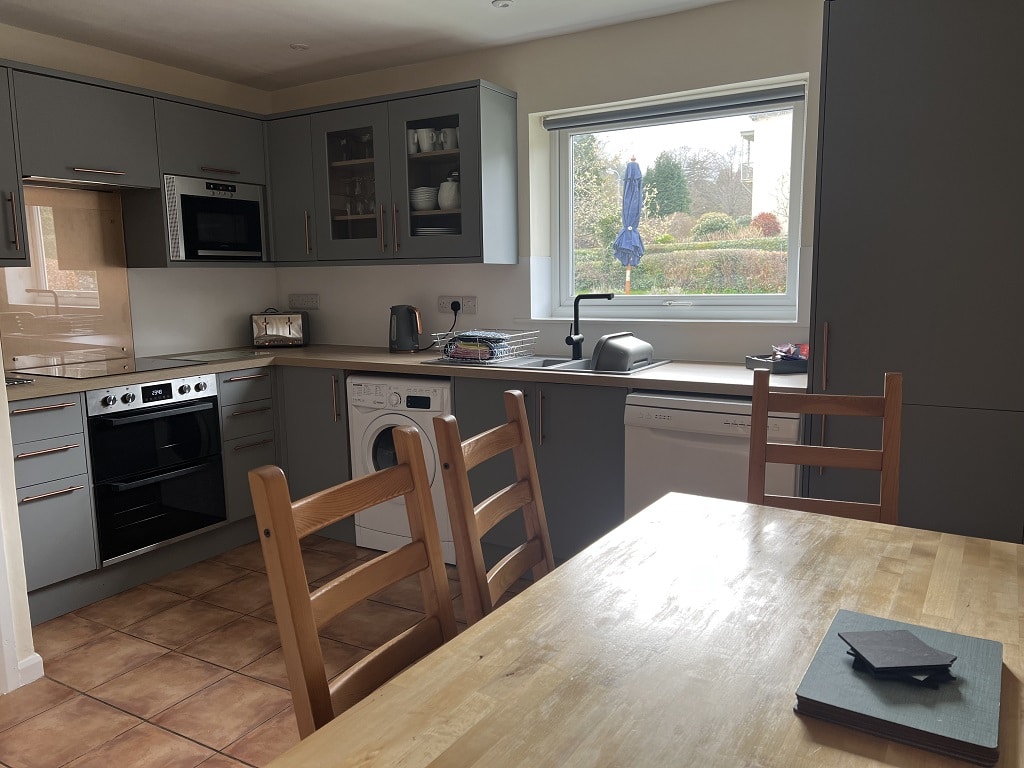 Dining kitchen with electric hob, oven and grill, microwave, refrigerator and freezer.