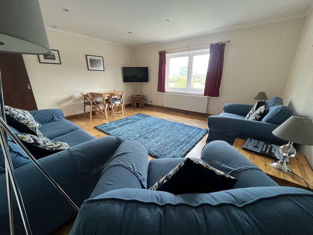 Lounge with sofas, chairs, and Smart TV
